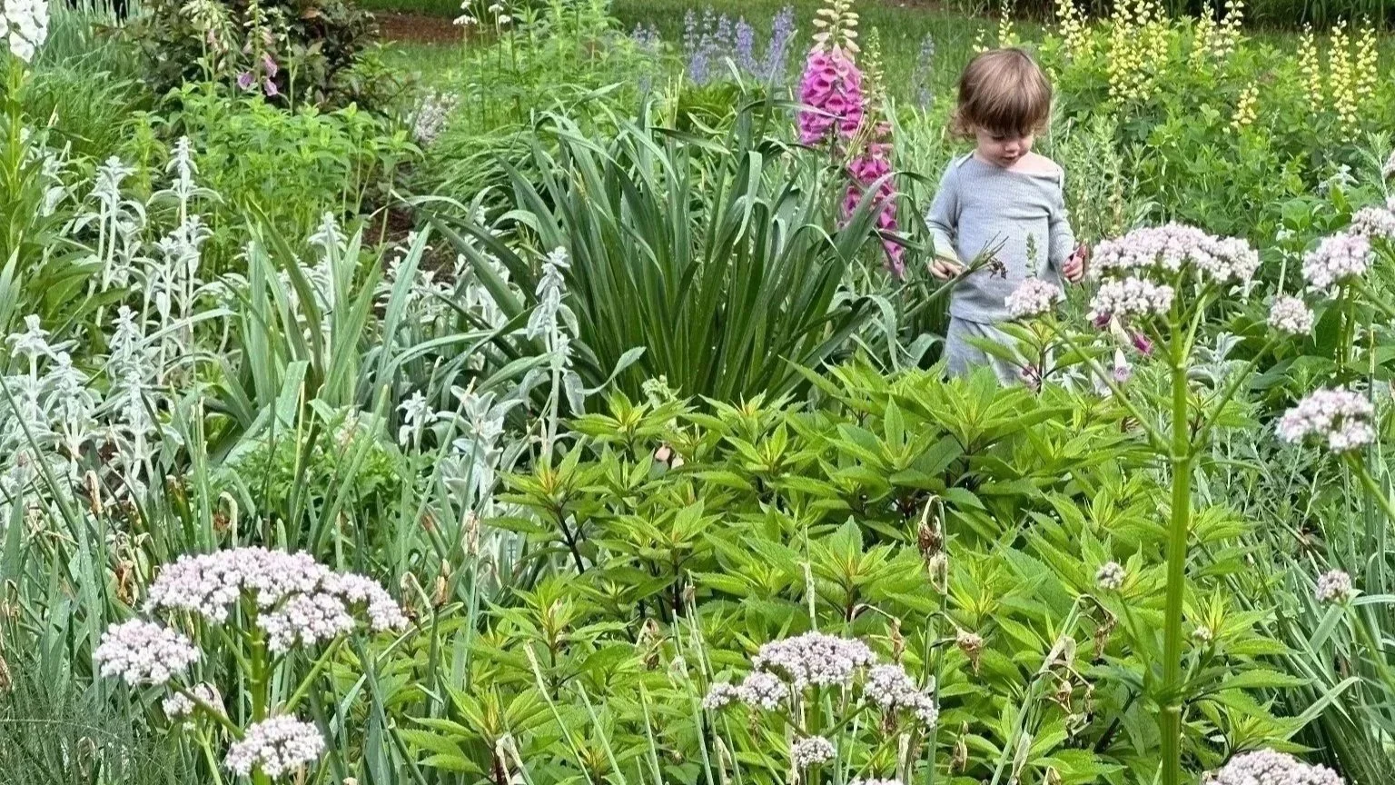 This garden reads as a richly layered, naturalistic planting designed for immersion and seasonal drama. Strong sweeps of strap-leaved foliage make a cohesive ground plane, while repeated vertical spires and airy umbels rise through the composition, adding rhythm and movement—giving the bed a meadow-like structure without feeling messy. The palette is softly orchestrated, with cool blues and lavenders receding into the midground and brighter pink and yellow flower spikes punctuating key moments, generating depth and a clear focal hierarchy. Behind the planting, an open lawn functions as a visual “breathing room,” and the woodland edge provides a dark, textured backdrop that makes the blooms and foliage glow while it reinforces a graceful transition from the cultivated garden to the surrounding landscape.