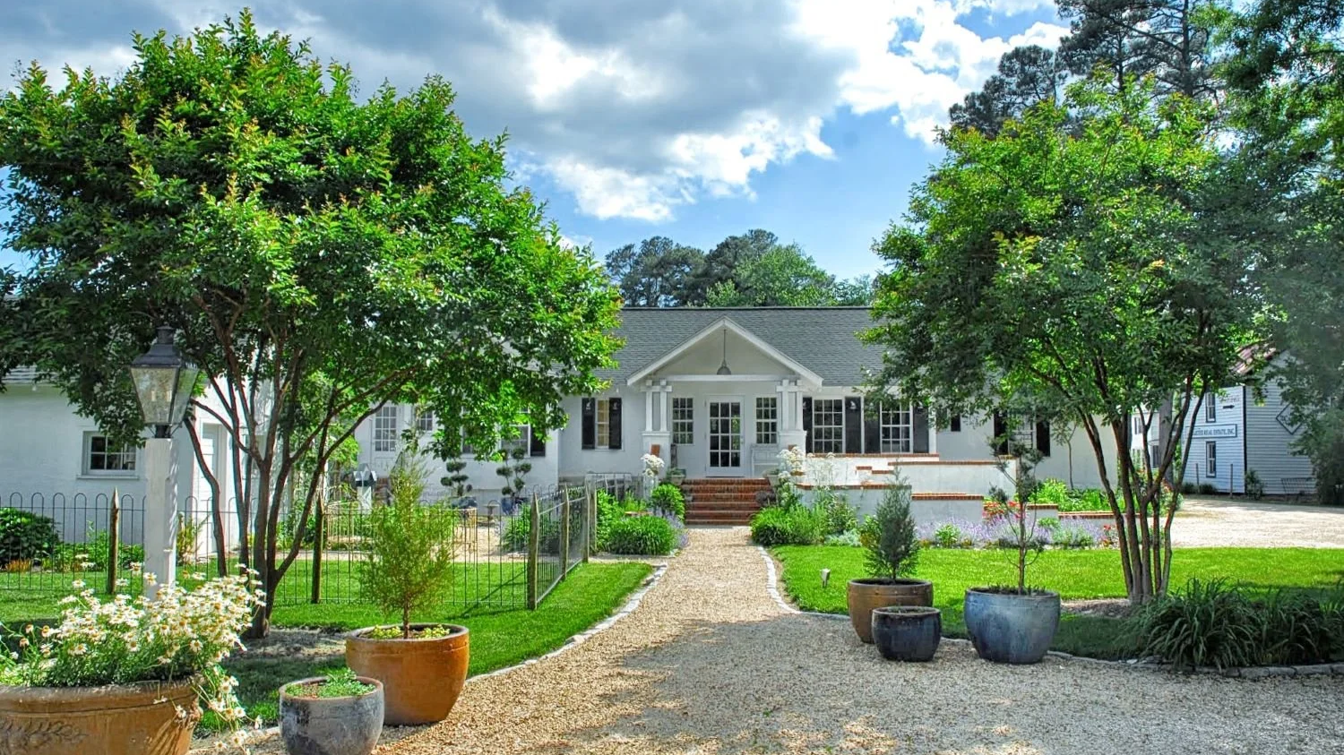 The approach to this commercial building is a simple, welcoming landscape structure that appears both orderly and relaxed. A broad gravel drive and walk establish a clear central axis to the porch, while two multi-stem trees act as a soft “allee,” framing the view and creating a shaded threshold without blocking the façade. Crisp lawn panels and low, neatly contained planting beds keep sightlines open and the architecture legible, while layered foundation plantings and seasonal perennials add texture and color at pedestrian height along the steps and terrace. Grouped containers in varied sizes introduce a curated, flexible element—great for strengthening the entry and making seasonal refreshes easy—while subtle path lighting and clean edging guide visitors and give the arrival sequence a composed, boutique-hospitality feel.